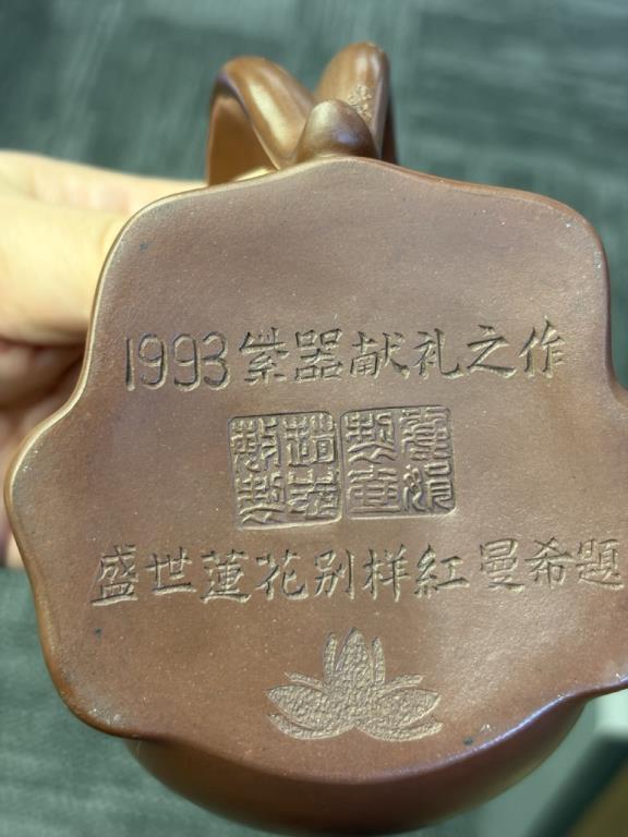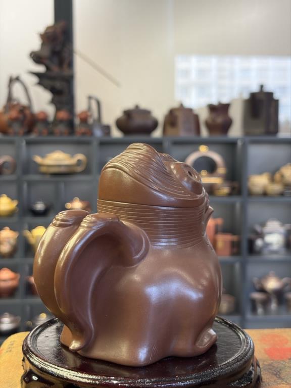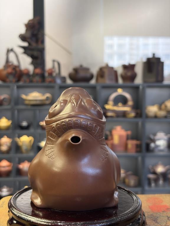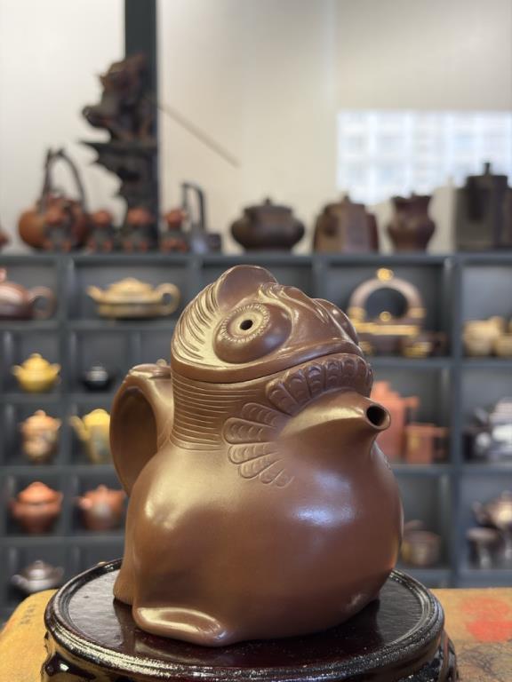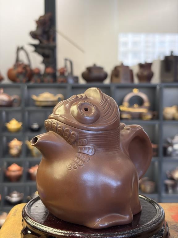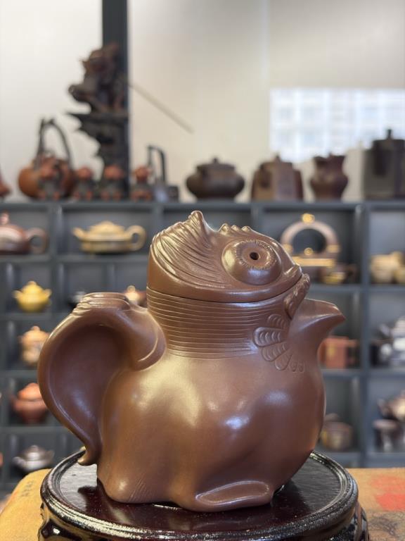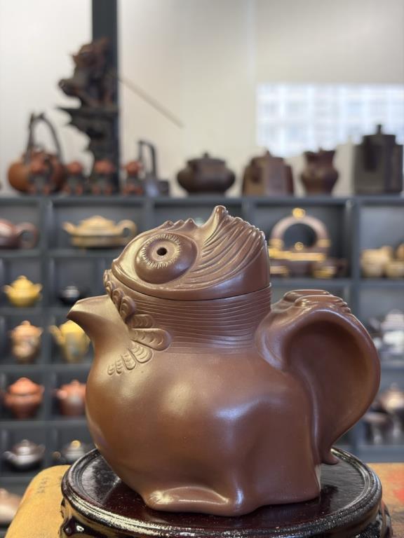 Trên mẫu ấm này, các thủ pháp cần có của điêu khắc đều được triển khai đầy đủ: lông vũ nơi cổ vừa là chi tiết tả thực của tạo hình, vừa trở thành lớp trang trí không thể thiếu trên thân ấm; đối chiếu với mào lông trên đỉnh đầu, làm nổi bật dáng vẻ sinh động và phong cách linh hoạt. Tác phẩm vì vậy không chỉ là một “con vật” dễ thương, mà là một cấu trúc điêu tố có dụng ý rõ ràng, liên kết chặt giữa cơ thể sinh vật và các cấu kiện của ấm trà.