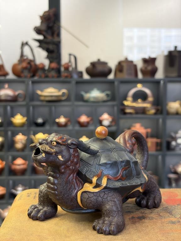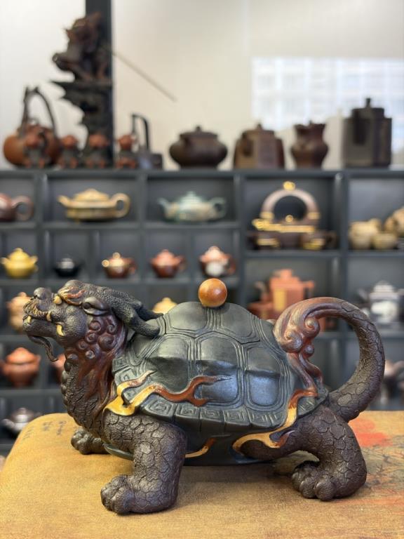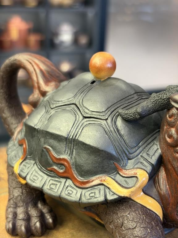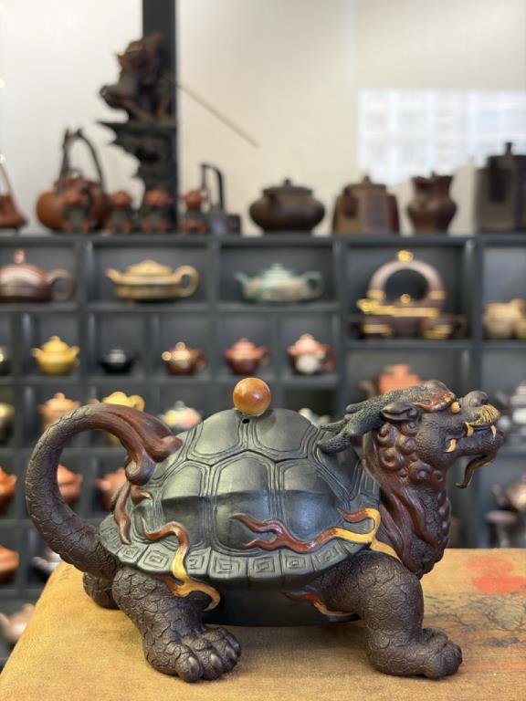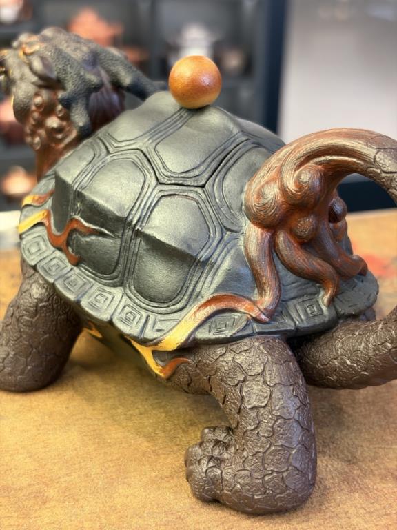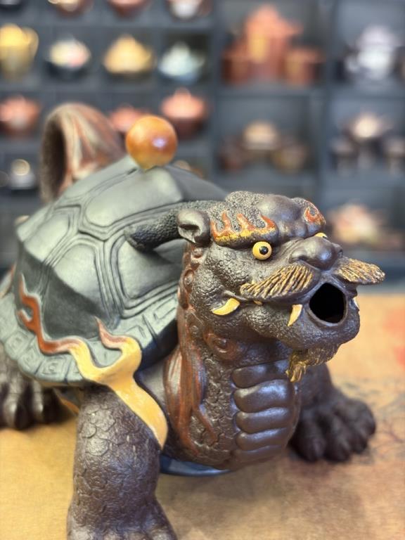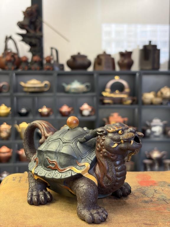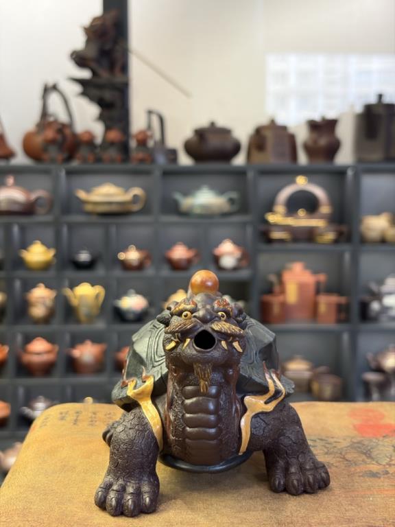 Long Quy Ấm là tác phẩm nguyên sáng của nghệ nhân Từ Hải Long, tạo hình theo thần thú long quy — dung hợp đặc tính của rồng và rùa. Tổng thể mô phỏng sinh động: thân hình có uy thế, vân lý tỉ mỉ; long châu được dùng làm núm; phần lưng là quy xác đồng thời là nắp, miệng–nắp khít kín. Đôi mắt long quy được xử lý “hữu thần”, tạo cảm giác linh động, sống động. Bố cục toàn khí hướng tới hiệu quả tinh xảo – uy vũ – cả hình thức lẫn tinh thần, ý vị dày và có “khí” mạnh.