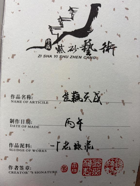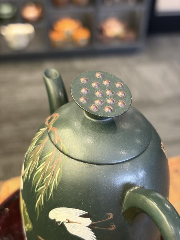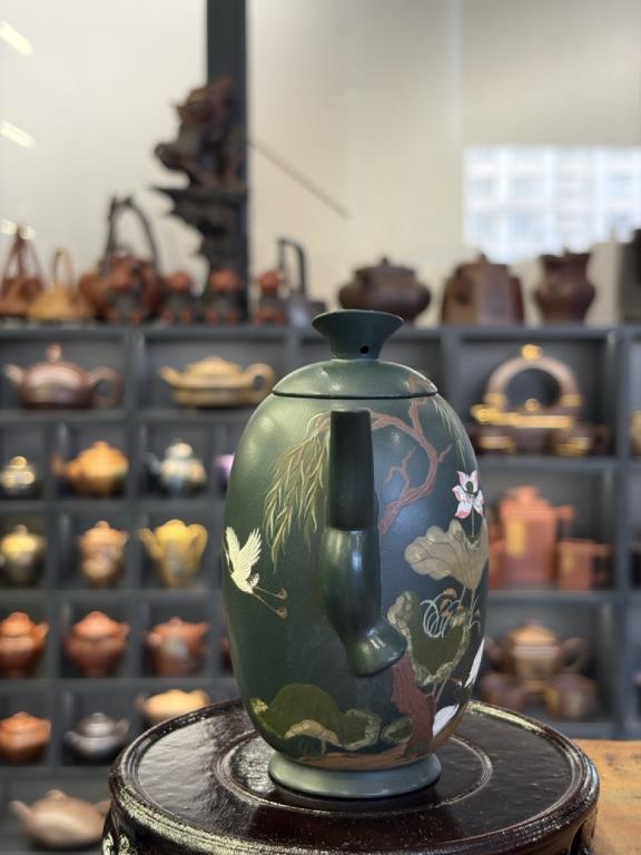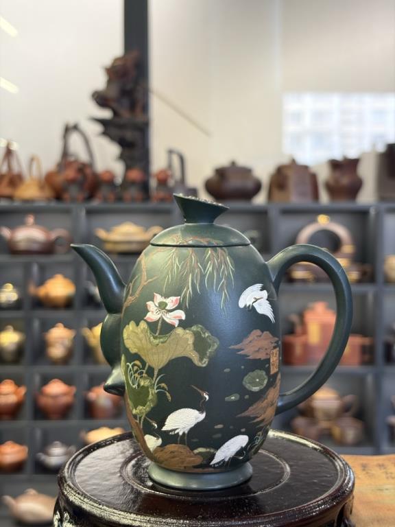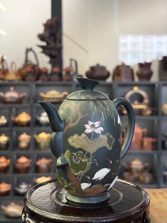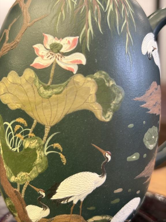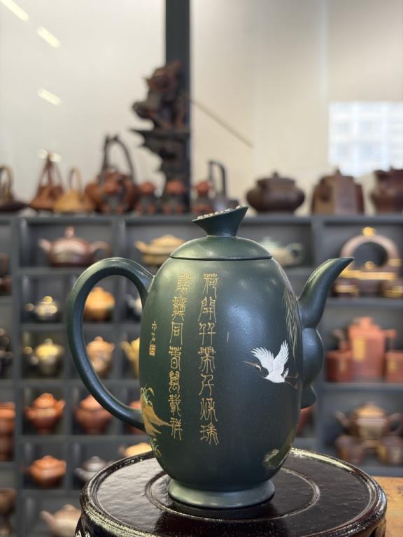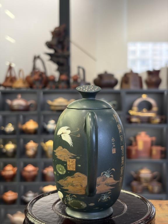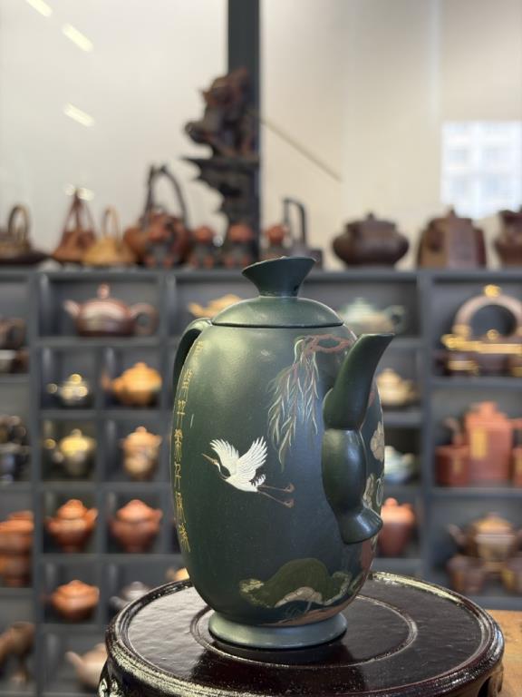 Giai Ngẫu Thiên Thành Ấm (佳偶天成) lấy nhan đề mang ý “thiên tác chi hợp” — nói về mối duyên trời se, biểu đạt quan niệm lãng mạn về hôn phối hạnh phúc, viên mãn. Trên thân ấm triển khai trang trí nê hội thủ công với hình tượng tiên hạc. Trong hệ biểu tượng truyền thống, hạc được xem là điểu tường thụy, tượng trưng cho hạnh phúc và cát tường, gửi gắm những kỳ vọng tốt đẹp.