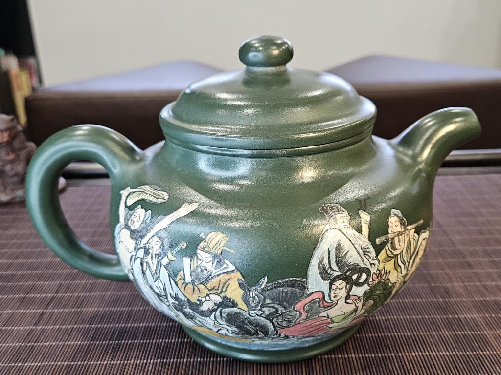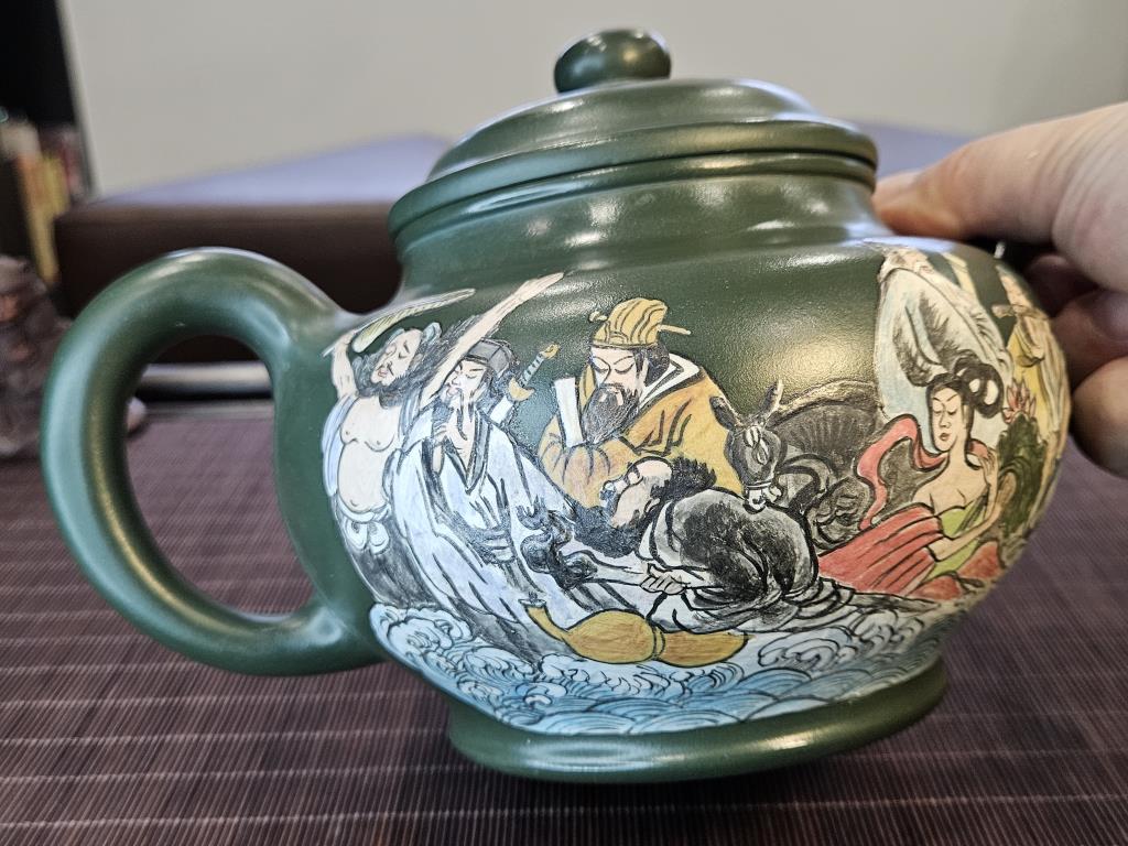 • Họa tiết trên thân ấm là bức tranh “Bát Tiên Quá Hải” (八仙过海) – một trong những truyền thuyết nổi tiếng của Đạo giáo Trung Quốc, miêu tả tám vị tiên vượt biển bằng những phép thuật riêng.