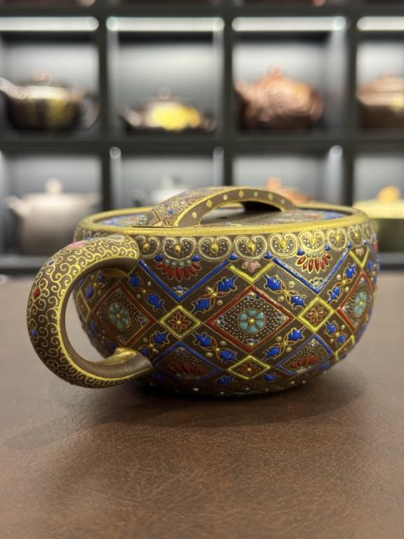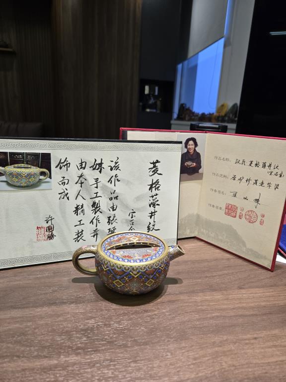 • Trong tác phẩm này, nghệ nhân Trương Lệ Muội mô phỏng họa tiết – bố cục – hoa văn hoàng gia, tạo nên một chiếc ấm không chỉ là dụng cụ trà đạo, mà còn là tác phẩm nghệ thuật độc lập