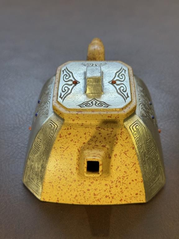 Tác phẩm được trang trí bằng kỹ thuật sơn mài màu thủ công (彩漆画技法) – một phương pháp độc đáo kết hợp giữa nghệ thuật sơn mài truyền thống và kỹ thuật tạo hình trên tử sa hiện đại.