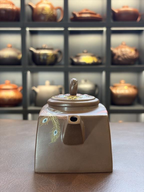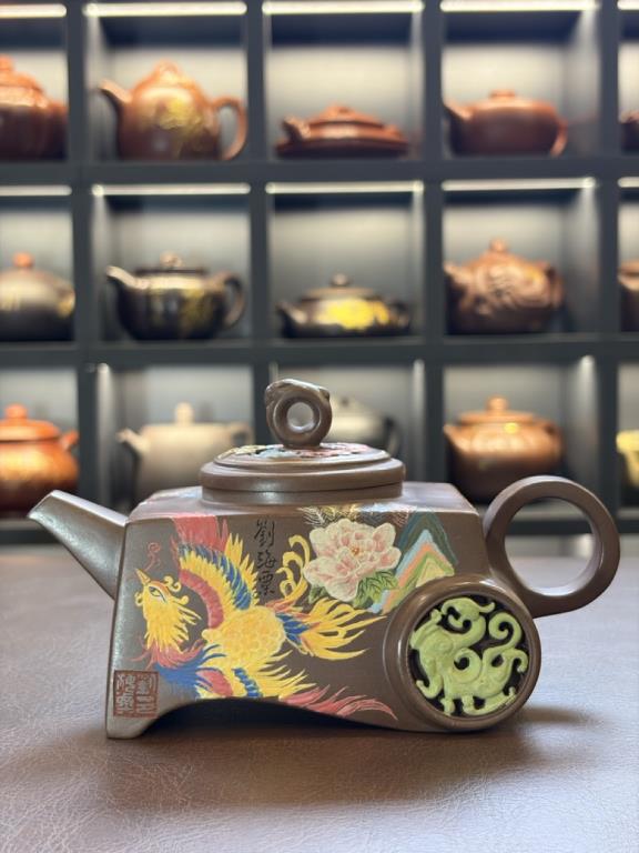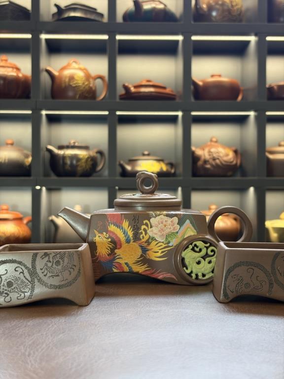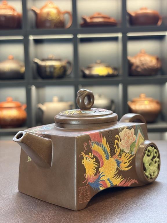• Nắp ấm có trang trí hình chim phượng (凤) được vẽ bằng kỹ pháp nê họa (泥绘),