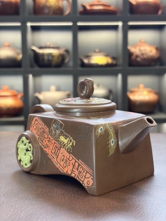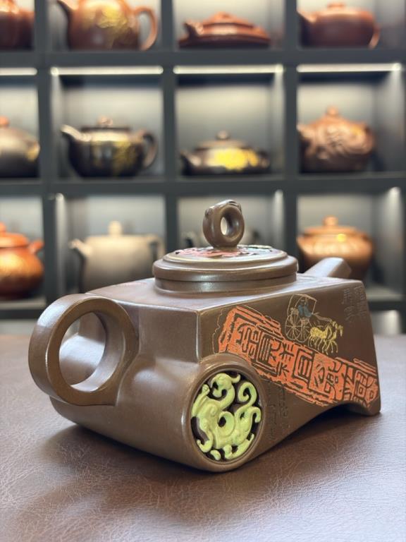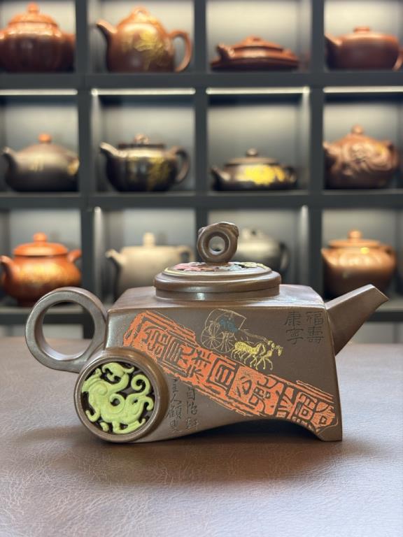 • Tay cầm và vòi ấm sử dụng họa tiết long (龙), và nắp ấm có thiết kế dạng lỗ thông khí (镂空), tượng trưng cho sự giao thoa giữa quyền lực, cát tường và mỹ học cung đình.