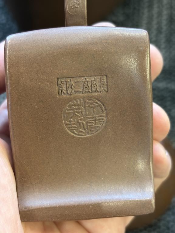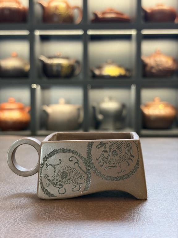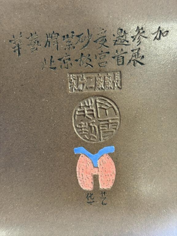 • Mặt còn lại có khắc đề từ của Cố Cảnh Châu (顾景舟, Gù Jǐngzhōu), đại tông sư tử sa cận đại, cùng với phần khắc thủ công của chính nghệ nhân Đinh Tuyết Anh – thể hiện sự phối hợp giữa ba thế hệ đại sư trong cùng một tác phẩm.