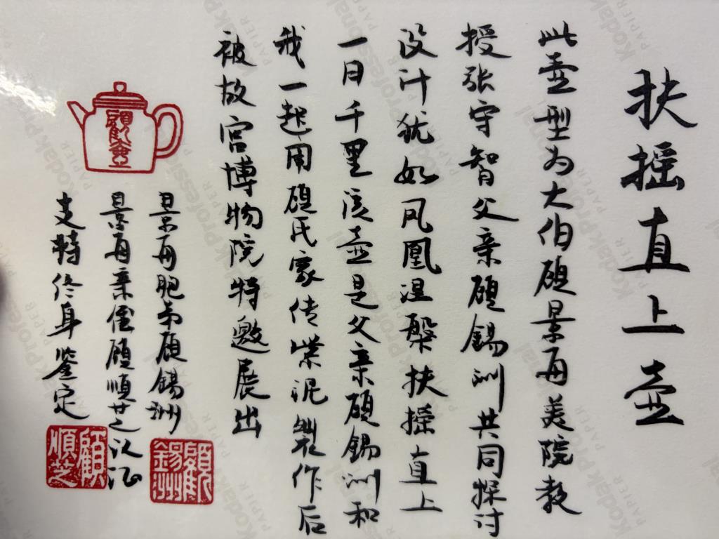 • Sau khi hoàn thành, ấm được mời triển lãm đặc biệt tại Cố Cung (故宫博物院 – Bảo tàng Cố cung Bắc Kinh) – đây là một sự công nhận đẳng cấp quốc bảo cho tác phẩm.