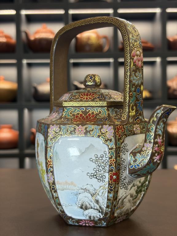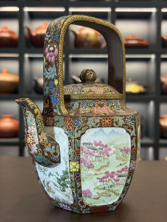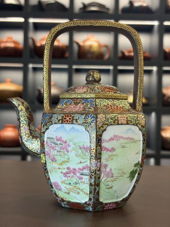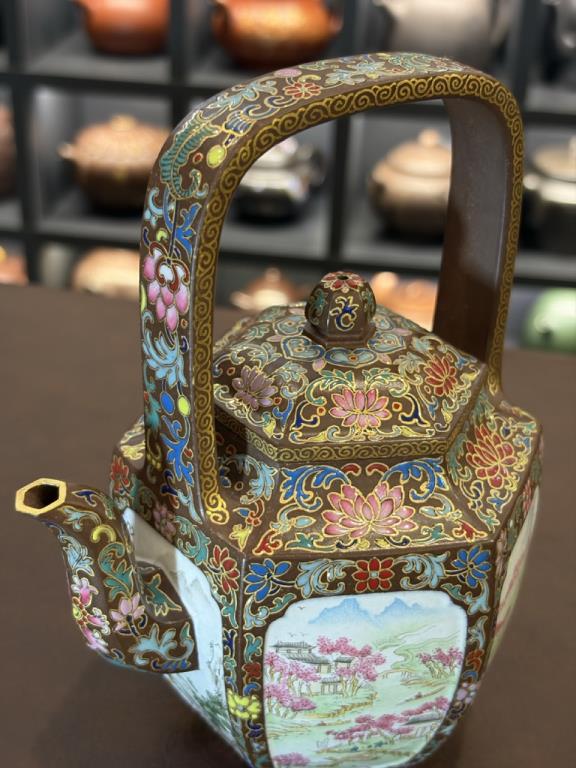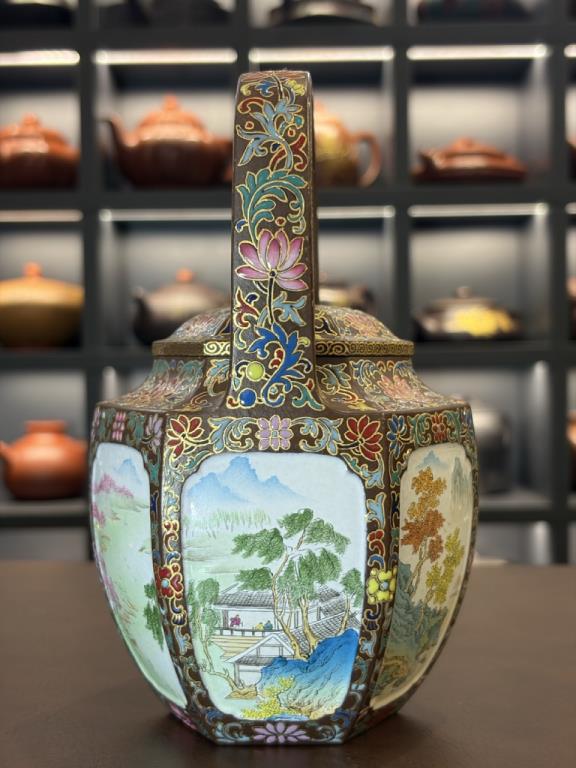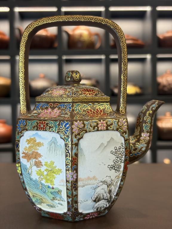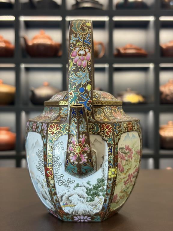 Tổng thể dáng ấm sáu cạnh đối xứng, phối hợp với quai xách cao, mang khí chất trang nhã – quý phái của đồ dùng cung đình thời Thanh. Trên bề mặt được trang trí bằng kỹ pháp Pháp lang thái (珐琅彩) do nghệ nhân cấp quốc gia đến từ Cảnh Đức Trấn thực hiện, tạo nên sự hòa quyện giữa nền tử sa thâm trầm và màu sắc rực rỡ của men vẽ thủ công, khiến toàn bộ tác phẩm toát lên vẻ cổ điển cao quý mà vẫn mang tính nghệ thuật đương đại.